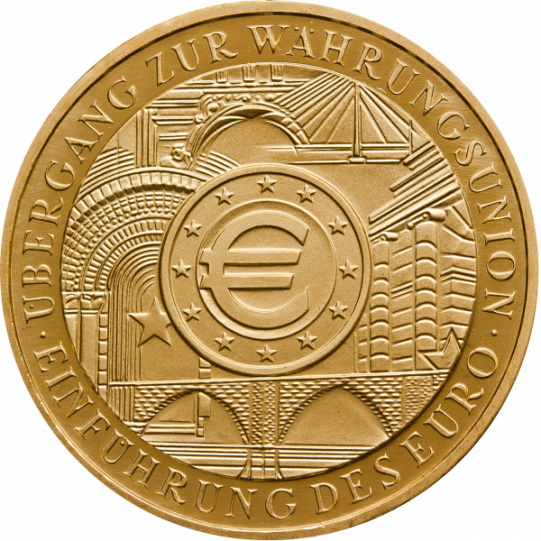 Zur Einführung des Euro und dem damit verbundenen Übergang zur Währungsunion wurde die Münze in höchster Feinheit und einem Gewicht von 31,1g (1 Unze) herausgegeben. Die Nachfrage ist außerordentlich, der Preis liegt grundsätzlich deutlich über dem reinen Goldwert. Ein begehrtes Sammlerstück mit Etui und Zertifikat.